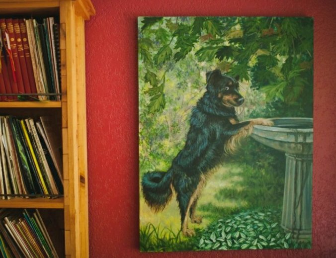 This dog made me care about a creature who needed me. This dog made me feel safe. This dog made me see that life is beautifully messy, something any partnership needs to witness from time to time. This dog made me understand what being a good neighbor means. This dog made me see conviction and preference and grace, sometimes all at the same time. This dog made me write. This dog greeted nearly two thousand students over the years who came over for class or a party or a review session or because they missed their own dogs at home or in the beyond, as it happens for college-age people. This dog made me look for when people should be gathered rather than separated, as herding dogs do. This dog made me watch my son learn to care and caress. This dog made me love without question. This dog made me agree to commission a dog oil portrait that at the time seemed too big and now seems too small.